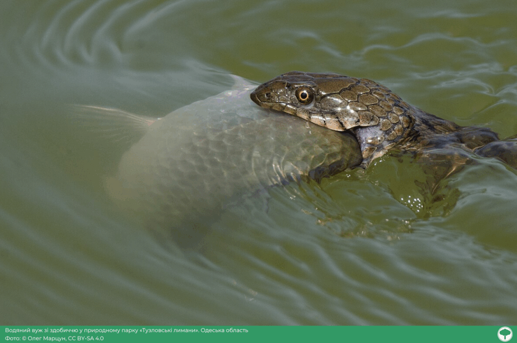 «На озері Малий Сасик, у Тузлівських лиманах, я натрапив на справжній “вужачий шведський стіл”. Десятки водяних вужів то тут, то там випливали з уловом — хто з бичком, хто з камбалою, а хто й з карасиком, як із трофеєм року. І саме один такий герой спіймав досить великого карася. Змій подиву гідний: тримає здобич, як чемпіон, але чи проковтнув він того гіганта — загадка. Пірнув у воду й більше не показався. На згадку залишив лиш цю світлину», — розповів автор фото Олег Марцун.